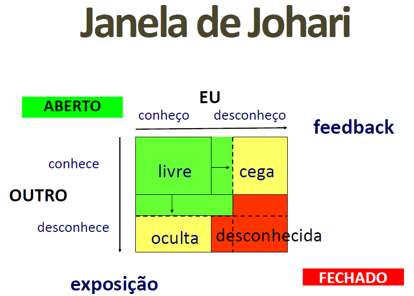 A Janela de Johari, criada por Joseph Luft e Harrington Ingham em 1955 é bem interessante para visualizar o grau de lucidez das relações interpessoais. O quanto eu conheço e desconheço em relação ao outro. A ideia é aumentar a janela livre para minimizar a zona cega e a zona oculta. Eu só consigo aumentar a janela se me colocar em exposição. No sentido do outro conhecer meu comportamento e assim poder me dar o feedback necessário para meu desenvolvimento pessoal.