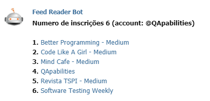 Uma funcionalidade do Feed Reader bot é adicionar uma conta do Twitter para acompanhar a timeline das pessoas que segue. A ideia é bem bacana e era a próxima coisa que eu queria experimentar no QApabilities. Antes de divulgar eu até fiz algumas tentativas frustradas, ainda não tinha conseguido entender como esse cara funciona.