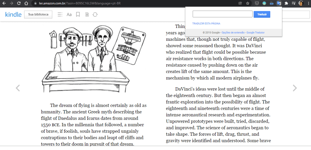 Só que para traduzir, tive que usar a extensão do “Google tradutor” instalada no Chrome, pode ser baixada AQUI. Basta acessar a página, logar para ter acesso a sua biblioteca, clicar na extensão e “TRADUZIR ESTA PÁGINA”.